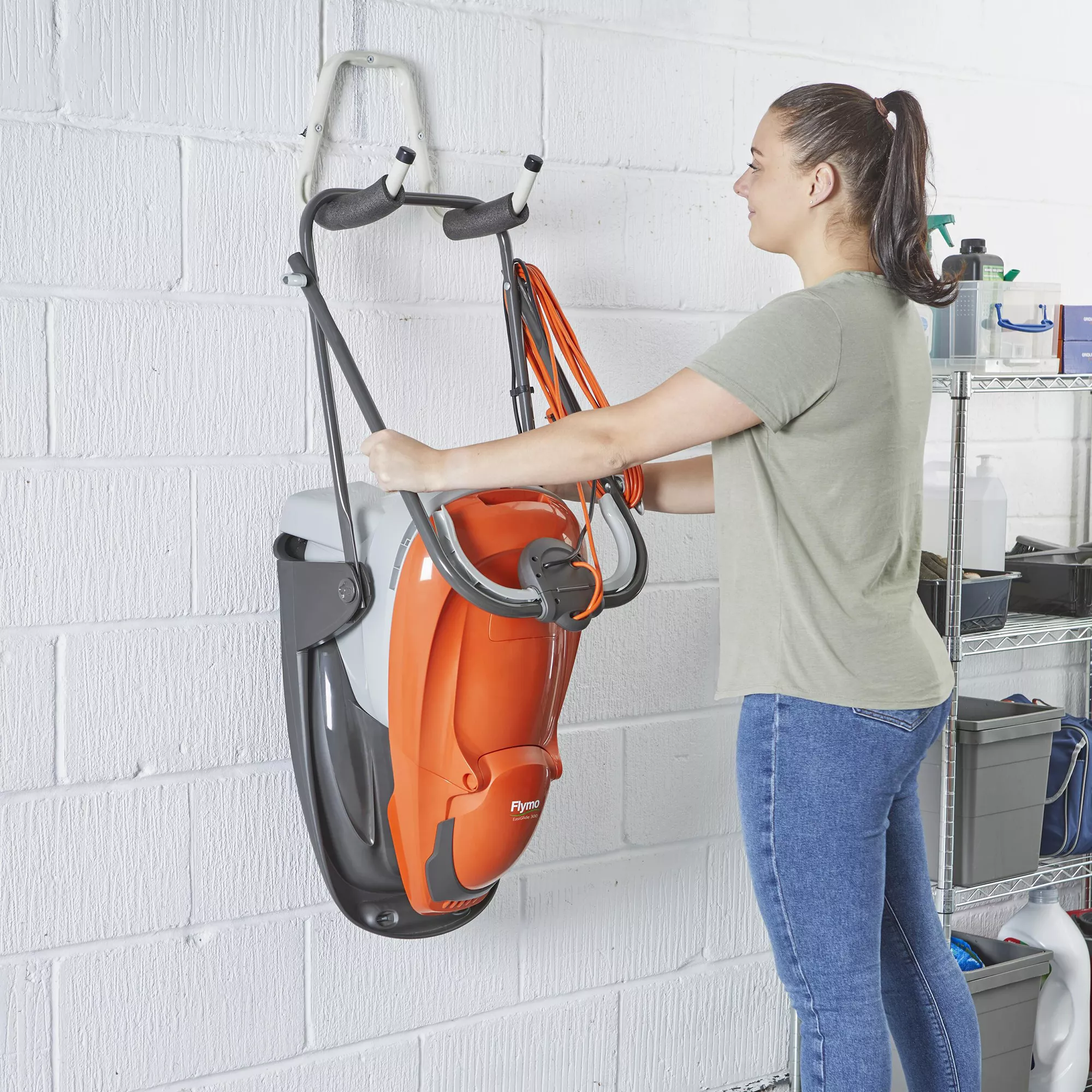Electric hover collect lawnmower with convenient grass box vision window, cable storage and neatly folds away.
