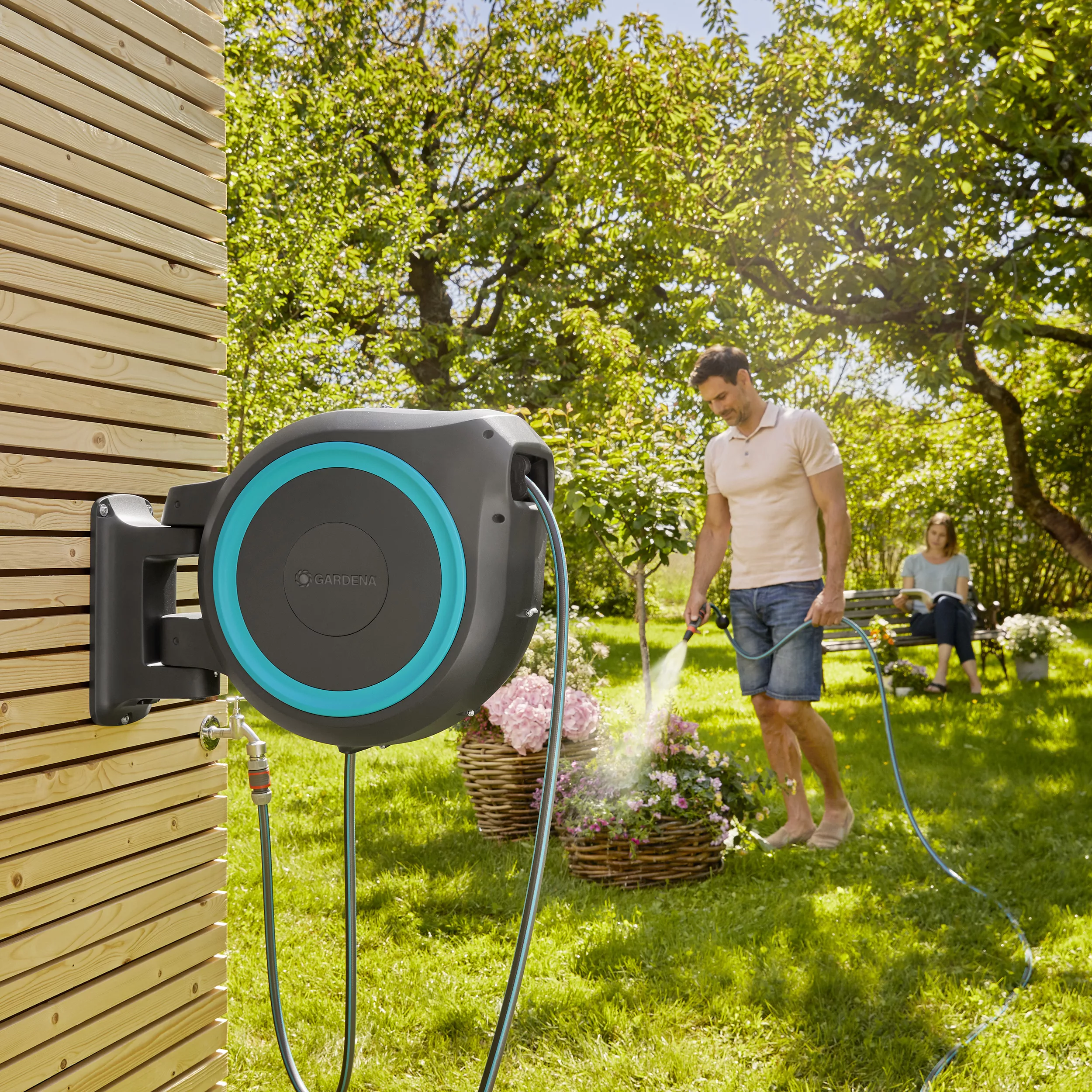 - Ready for immediate use: Including wall bracket, 35 m hose, 1.5 m connecting hose, all required Original GARDENA System Parts and a nozzle with two different spray jet options