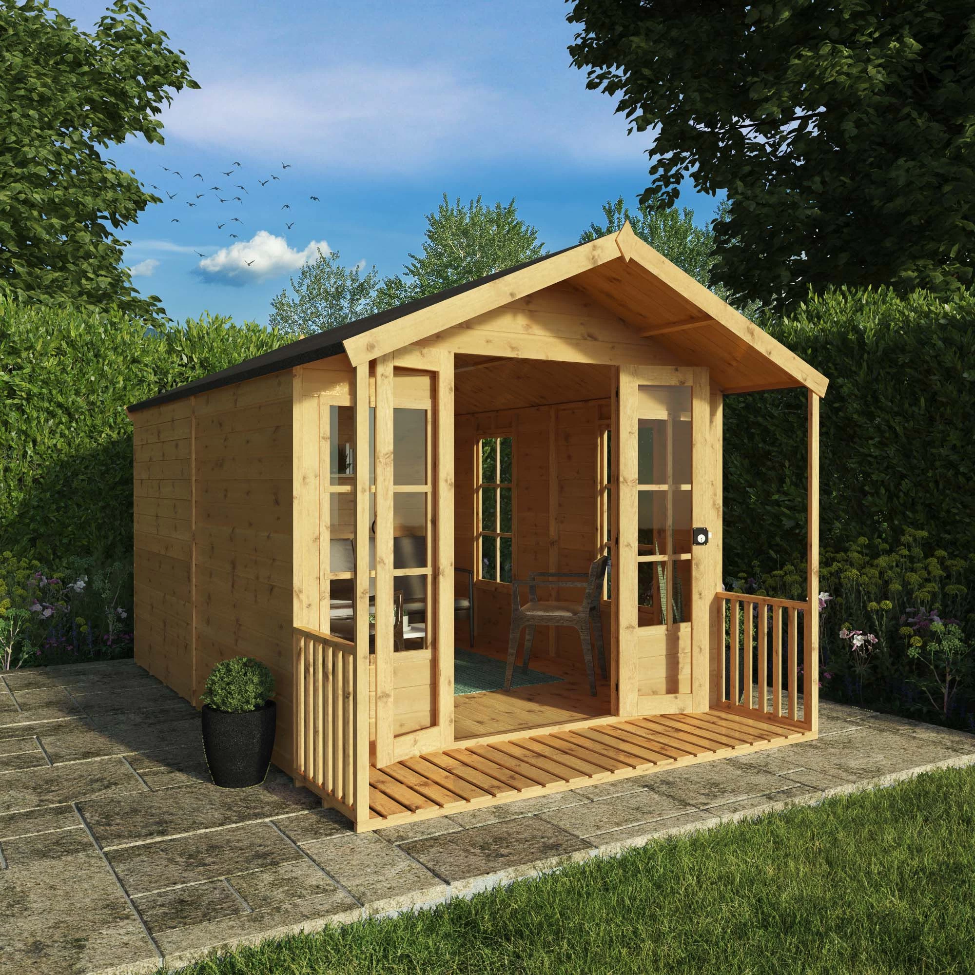 This spacious and stylish 12ft x 8ft Traditional Summerhouse offers the perfect place for entertaining guests or as somewhere to sit back, relax and enjoy the views of the garden. Featuring four large styrene glazed windows, the interior is bright and inviting. French doors open out onto the sheltered veranda, creating a light, airy and welcoming space to enjoy. The walls of this summerhouse are constructed using premium horizontal interlocking tongue and groove boards with a shiplap profile. The shiplap profile includes a protective and aesthetically pleasing lip to create a strong, weatherproof panel.