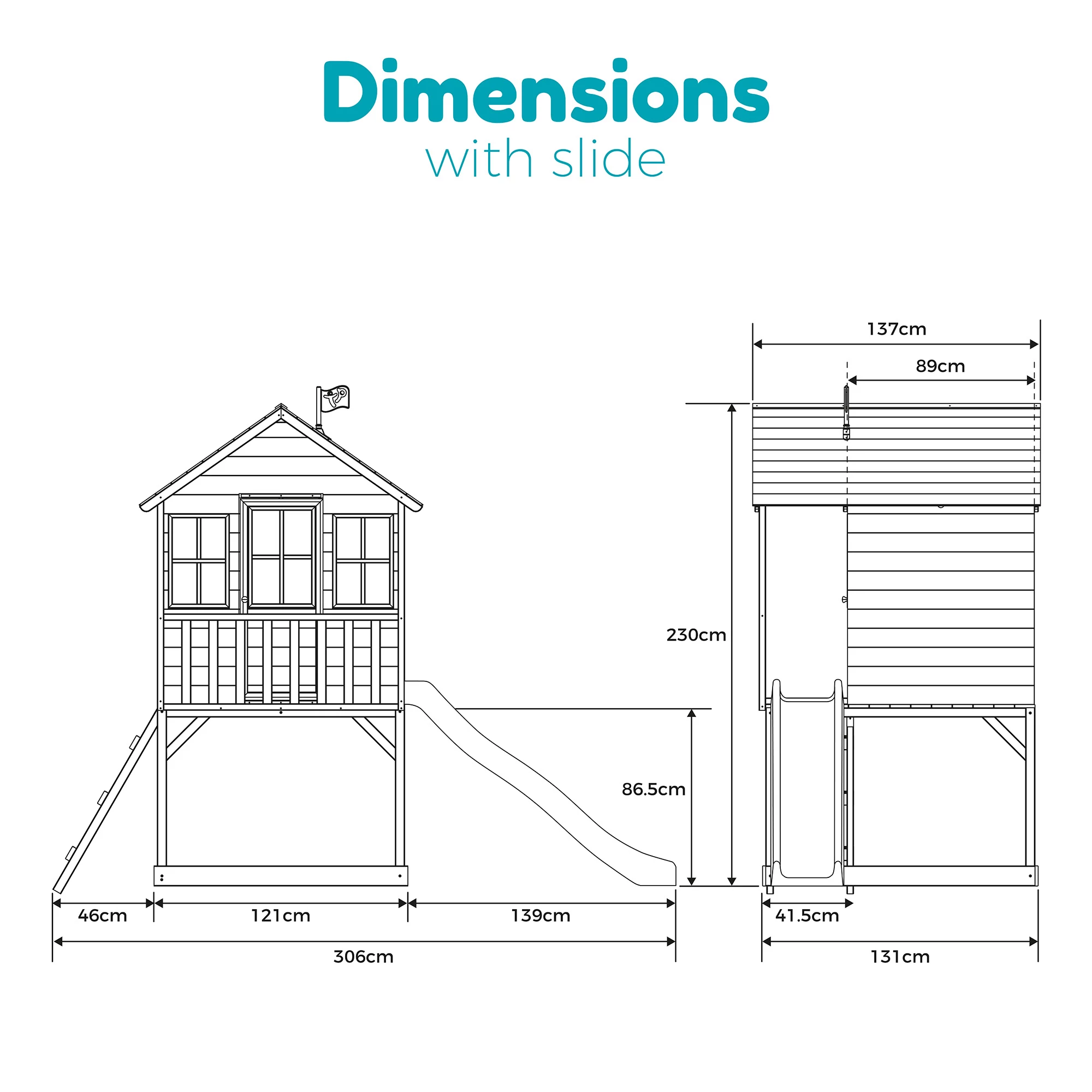 This fun playhouse just got even better! It is now raised up on a sturdy platform with verandah which kids will love to climb. The shady space created by the platform is an ideal for sand play. The included 1.8m slide is ideal for quick exits. The Hill Top Wooden Playhouse will soon become a favourite garden hideaway.